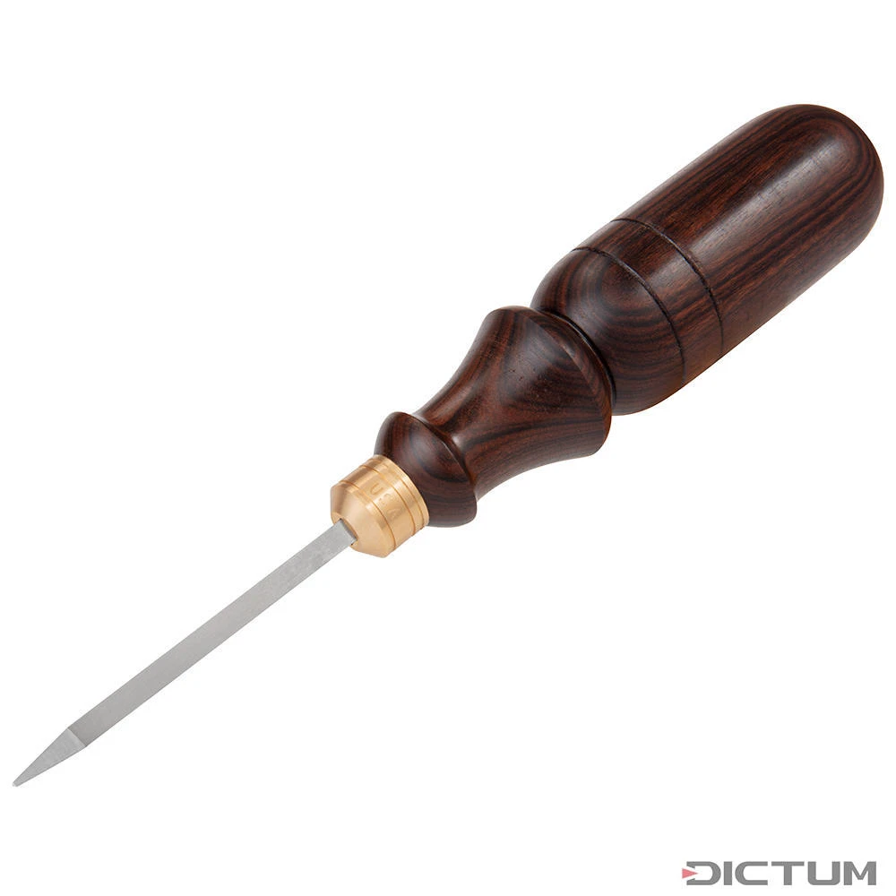 Alêne en carbure monobloc avec pointe affutée pour un marquage et un pré-perçage précis de trous dans les bois tendres ou durs. Les arêtes vives, de la pointe pyramidale à 10° jusqu’à la virole, coupent de manière nette chaque fibre de bois. Idéales pour le pré-perçage de trous de vis ou de clous – sans fendre le matériau. Le manche en palissandre de Santos, finement poncé et recouvert de plusieurs couches de vernis à la gomme-laque, a un design attractif et offre un toucher particulier. L’extrémité arrondie et ergonomique du manche et le creux pour les doigts au bas du bord de prise assurent une transmission optimale de la force et une prise en main sûre. Carbure monobloc (VHM) trempé à 92 HRC. Diamètre du manche : 34 mm.