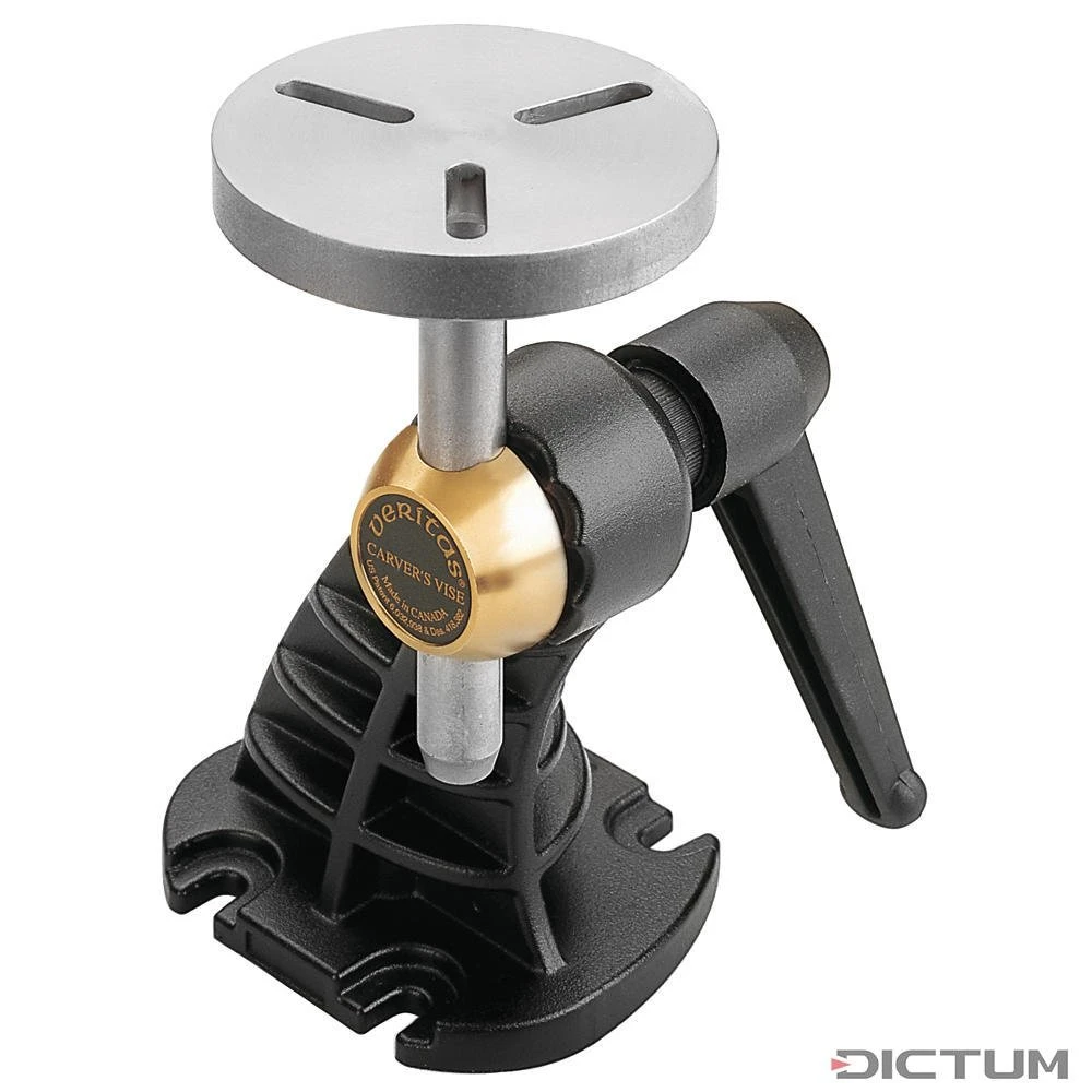 Robuste étau de sculpteur à plateau tournant et escamotable. Le couplage dentelé et le socle massif d’aluminium permettent des charges plus conséquentes. Fixation par quatre vis de socle ou un bouton fileté central (fixation p.ex. avec une mèche de tarière à bois N° 717235). Base 115 x 90 mm, hauteur max. 240 mm.