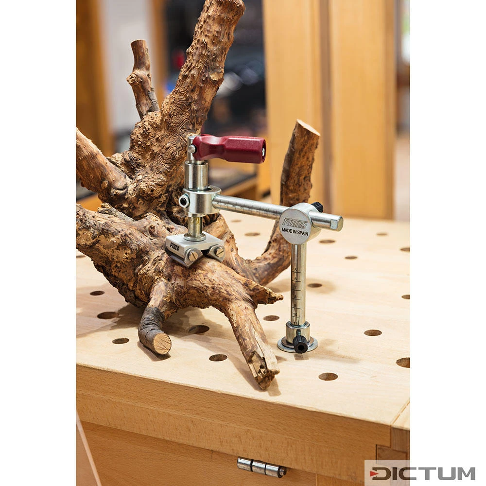 Développé à l’origine comme système de serrage pour les tables de soudage, le TCP offre de nombreuses caractéristiques qui sont autant d’avantages pour le travail du bois massif. Le serre-joint à pompe robuste offre une énorme force de compression et serre aussi bien les pièces de forme plate que les pièces de forme ronde. Le mécanisme du boulon de pression pivotant et inclinable peut être orienté dans presque toutes les positions. Comme le boulon de pression n’est pas entraîné pendant le serrage, cela empêche les pièces en bois encollées de s’écarter. Grâce à la grande mobilité du boulon de pression, le système de serrage est adapté aux objets organiques, aux rhizomes, aux bûches, etc. par exemple pour les travaux de sculpture. Ø de tige 16 mm. Douilles de réduction de Ø 25 mm et 30 mm à 16 mm, pour l’utilisation sur les bancs d’établi, disponibles comme accessoires. 25/16 mm N° 730097, 30/16 mm N° 730098.